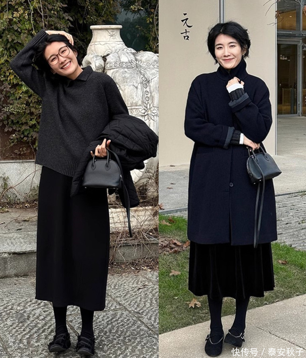 尤其是这种长度在脚踝附近的小黑裙,更是“梨形妈妈”们用来遮肉、修身的利器之一。怕冷?就在小黑裙的里面,穿条肉色、或是同色的加绒打底裤,低调大方。关键是还非常显瘦。