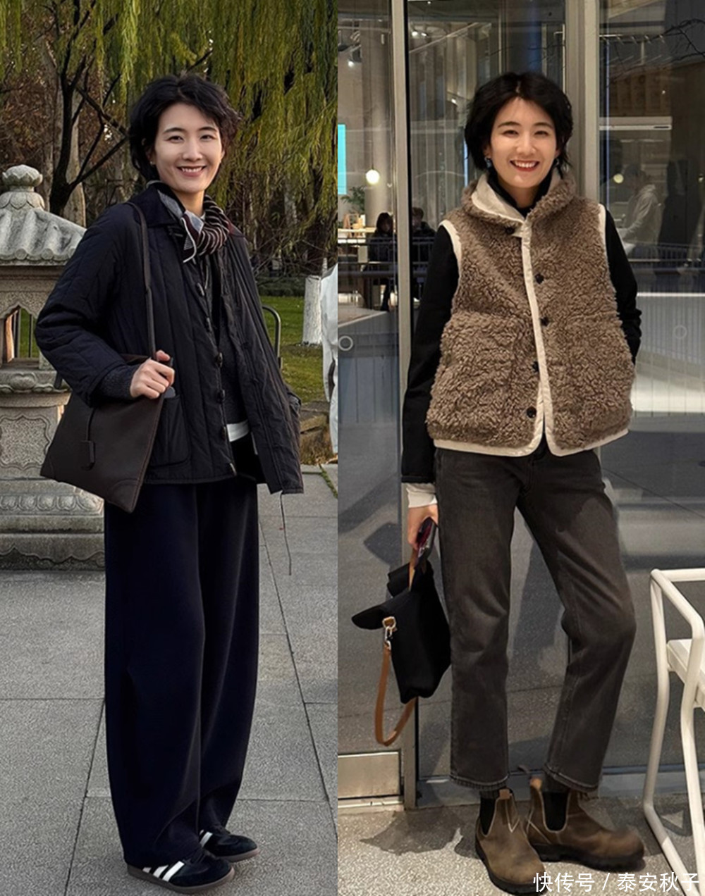 因为毛绒外套还是比较厚重的,所以我们的内搭一定要轻薄、保暖,再以稍微宽松的直筒牛仔裤加持,也是很减龄很大方的。